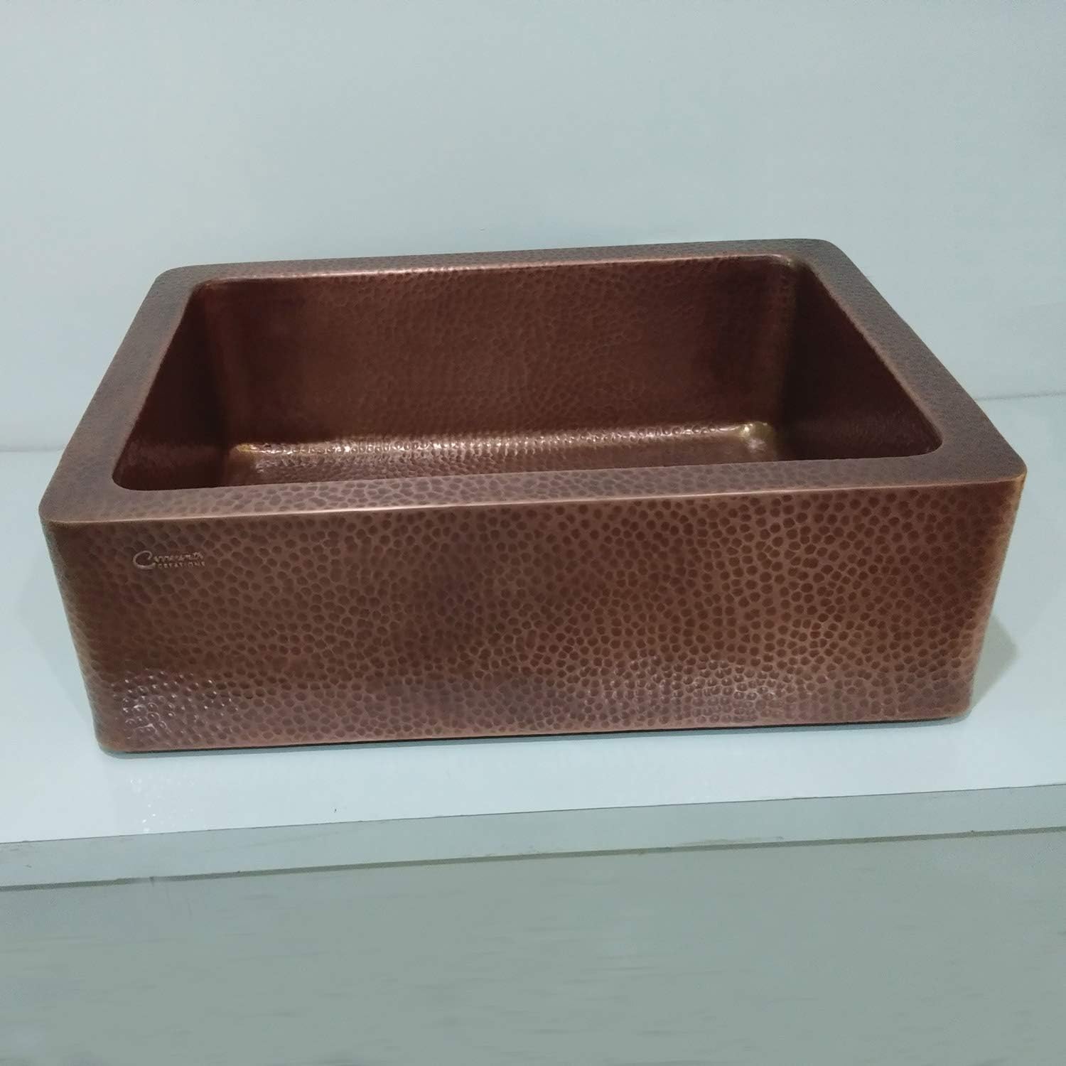 - SPECIFICATIONS: Thickness: 16-gauge, Dimension: 23.50’’ L x 17.50’’ W x 8’’ H, Front Apron Design: Hammered, Finish: Antique Copper. As the luxurious texture of the copper reacts with the atmosphere it will acquire a warm patina with age, giving it an old-world character to the copper’s appearance. Made for superior strength and durability each sink is 100% pure 16-gauge copper to prevent scratching, corrosion, and dents.
